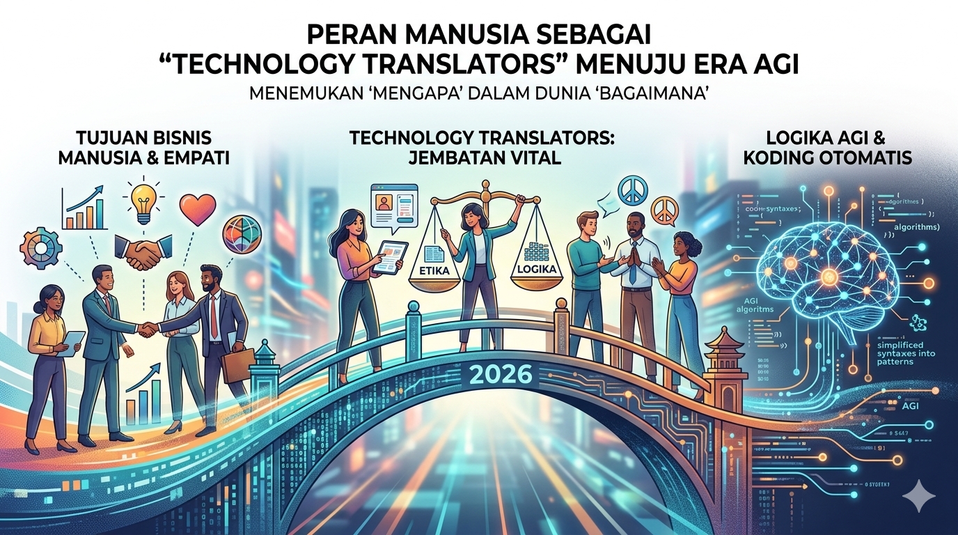 Seiring arsitektur algoritma bergerak semakin dekat menuju AGI (Artificial General Intelligence), peran teknis murni seperti penulisan sintaks menjadi komoditas otomatis. Kompetensi paling langka dan berharga di tahun 2026 bukanlah kemampuan koding teknis, melainkan kecerdasan empati: peran manusia sebagai Technology Translators.